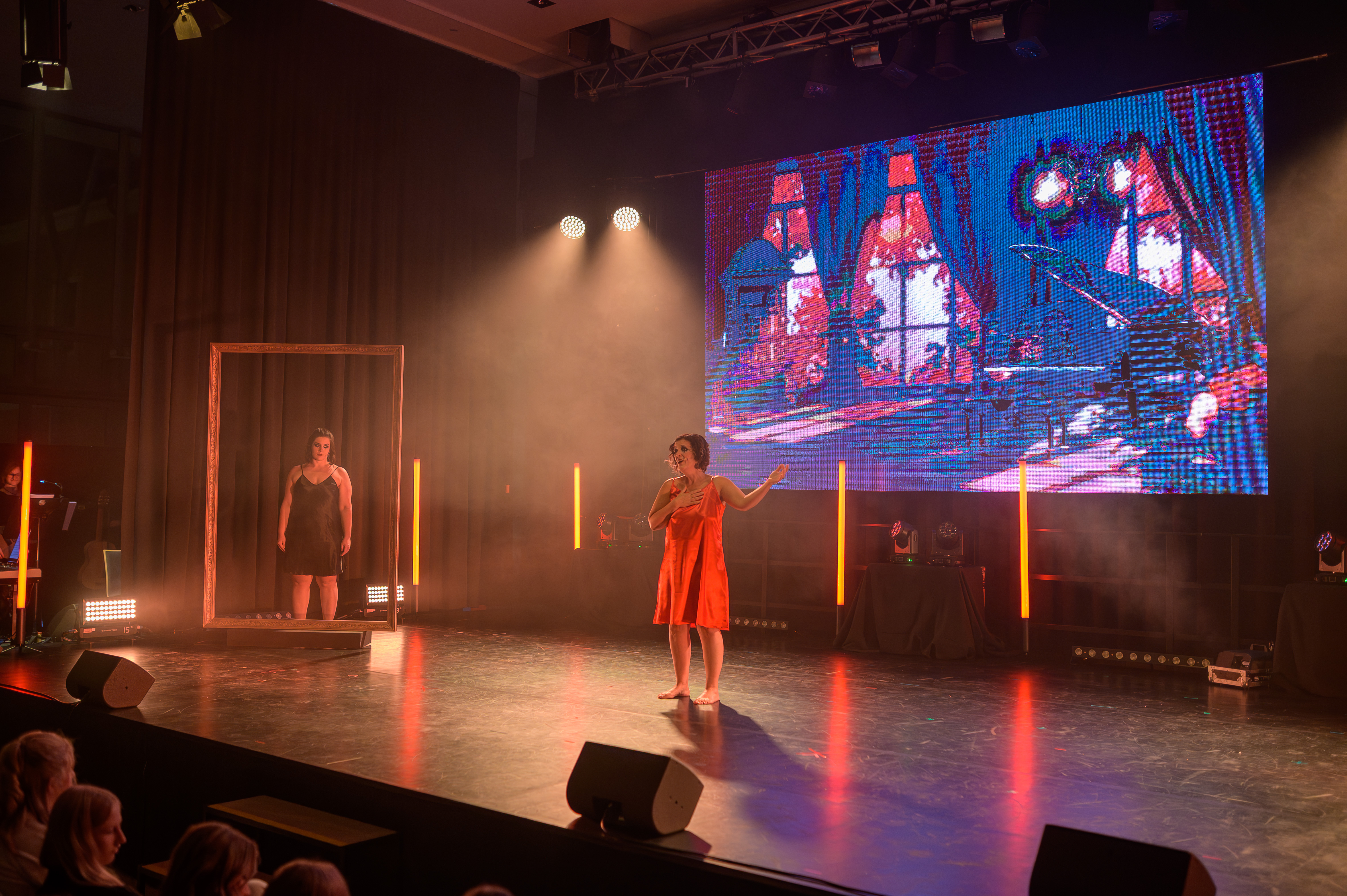 Akt I beginnt mit einem Ausflug in die schrille Welt der Rocky Horror Show, wo schräge Charaktere und mitreißende Songs das Publikum in eine bizarre Realität entführen. Von dort taucht die Inszenierung in die düstere Atmosphäre von Tanz der Vampire ein, wo die Sehnsucht nach Unsterblichkeit und die Verlockung der Nacht im Mittelpunkt stehen. Die Reise führt weiter nach Manderley in Rebecca, einem Ort, an dem die Vergangenheit nicht loslässt und dunkle Erinnerungen lebendig werden. Den emotionalen Wendepunkt des ersten Aktes bildet Mozart!, wo mit leiser Kraft eine Geschichte über Träume, Freiheit und das Ringen mit dem eigenen Schatten erzählt wird.